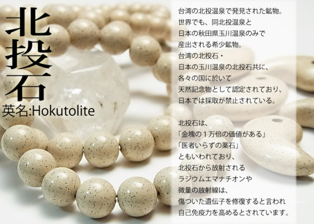 ラウンドビーズとして一般的に流通している北投石は、北投石の粉末・小片をセラミックにより加工を施しております。